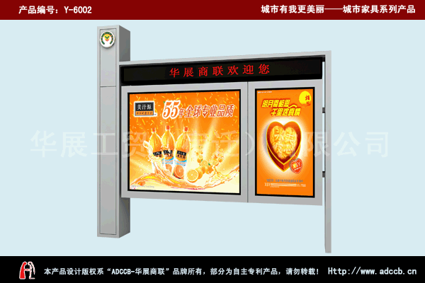 宿迁华展工贸有限公司为国家三级钢结构资质企业,主要从事生产广告垃圾箱,公交候车亭、路名牌、景观灯箱、阅报栏、滚动灯箱、的士亭等城市设施类产品的生产和投资。工厂拥有多年机械机电设备生产加工经验,公司以“诚信为本、质量第一、客户第一”为原则,以一流的产品引导市场,与国内众多广告公司、政府单位建立了稳定的业务合作关系,得到了客户的一致好评,公司热诚欢迎您前来我司参观、洽谈合作。 欢迎垂询宿迁华展工贸新款候车亭、新款阅报栏,新款滚动灯箱设计生产,来厂看样定、图册资料索要。 |