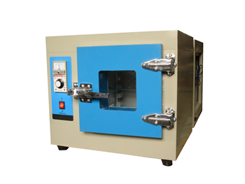 本品工作室下部装有发热丝,左侧装有鼓风装置,温度控制仪控制温度恒定及高低,工作时空气由箱底进气孔流进,经发热丝加热再经鼓风装置流入工作室,再由箱顶排气孔排出。本品工作室与外壳之间有玻璃纤维做保温材料,外壳用钢板制成,静电粉末喷涂箱体表面,工作室分用钢板和不锈钢板制成两个型号,箱门中间有用钢化玻璃制成的观察窗。