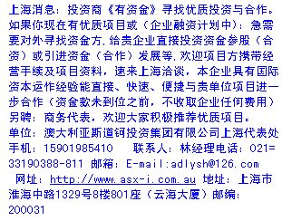 [摘要]拓展中国大陆市场:投资商《有资金》寻找优质项目投资与合作! 澳大利亚斯道钶投资......