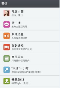 凡客也在自己的微信公众号上做智能客服的事情,比如会开辟“凡客小薇”、“货到通知”、“商品问答”、“大话一小时”等新栏目(见下图),鼓励用户拿起微信与凡客沟通。比如,你购买的衣服到货之后,凡客小薇会发来消息说,你要不要拍照或者语音分享一下对新衣服的感觉,而系统会自动关联到这件商品上,完成晒单与评价的流程。