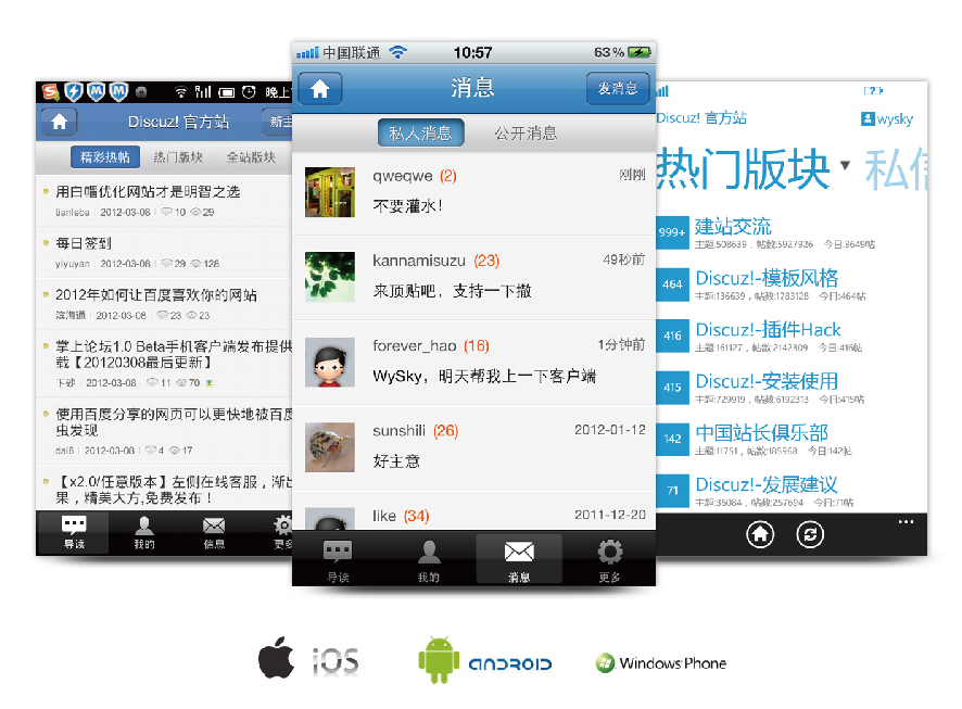 为响应站长需求,Discuz! 还推出手机客户端产品“掌上论坛”,以帮助论坛网友更好的用移动设备来访问论坛。手机用户可以通过掌上论坛即时参与论坛互动、分享内容、发帖灌水,支持便捷的看帖、回帖与收藏等操作,掌上论坛还结合了手机拍照,实现即拍即发,让用户随时随地分享自己的所见所闻。